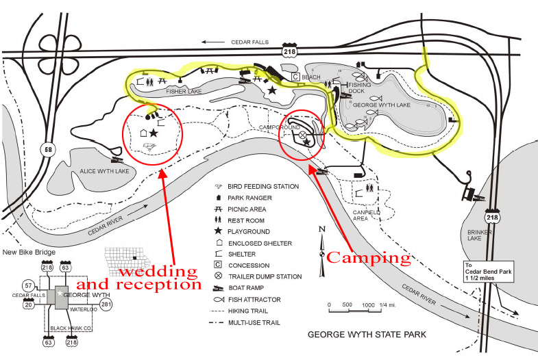 The Wedding is at George Wyth State Park in Waterloo, Ia (very close to Cedar Falls, Ia.) Bacheler party is TBA (watch this space) but will probably be at Ryan's place the night before where we will have fire. The park is near enough to both Cedar Falls and Waterloo that, if you are staying in a hotel, either town would be fine. Food is about a 10-15 minute drive to get to wherever your going in either town. I've provided some maps for you. Pay special attention to the two edited maps I've created, those will be the most valuable. If you are camping with us please be sure to RSVP so that we can assign you a camping spot.